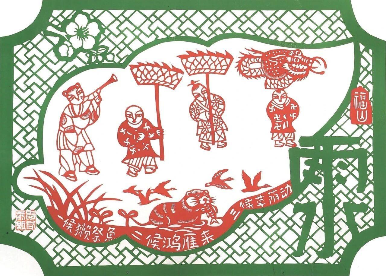 今日雨水,这幅《二十四节气之雨水》剪纸作品由福山非遗传承人卫爱君老师创作。作品以红绿撞色勾勒出节气与民俗交融的生动图景,构图精巧,意蕴悠长,尽显福山剪纸的独特韵味。