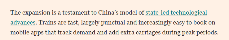 报道分析,高铁网络的快速扩张体现了中国以国家为主导推动技术进步的模式。列车不仅速度快,而且准点率很高。如今,通过手机应用程序订票也越来越便捷,这些应用能实时监测出行需求,并在客流高峰期增挂车厢。专家表示,中国的成功得益于多重因素的叠加:巨大的市场规模、标准化的设计以及有利的政策环境。