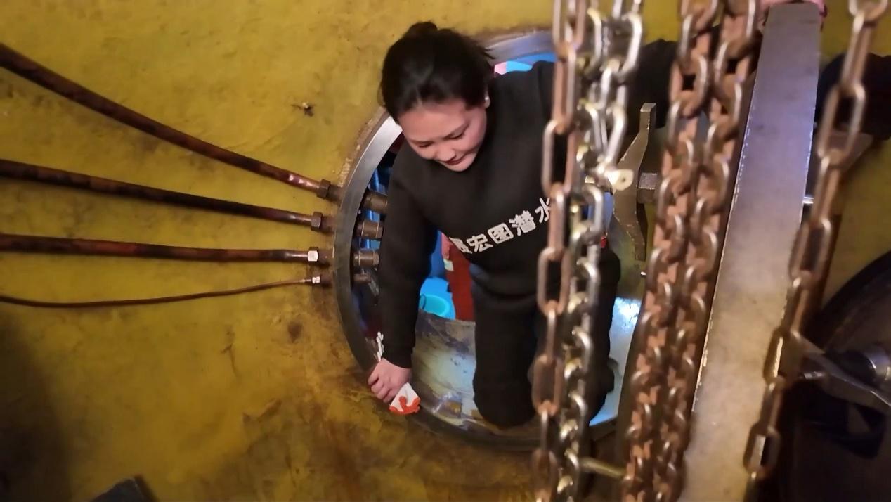 五十多分钟后,减压舱内机器工作的声音减弱,舱门被打开,记者重新见到了赵春霞。此时的她,头发已经全部打湿,不仅如此,她贴身穿着的衣服也湿了大半。每次潜水作业,身体承受加压、减压的过程,还要忍受冬季江水的冰冷,这对每个潜水员来说都是挑战。但在赵春霞看来,热爱能抵万千。