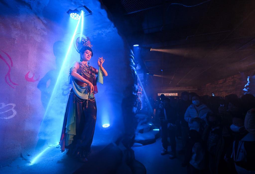 马年春节期间,宁夏银川市贺兰山下格外热闹。走进西夏陵博物馆后数百米长的廊道,游客仿佛穿越回千年前的西夏——身着各民族传统服饰的“商贾”沿街叫卖,“麻魁”女兵英姿飒爽,西夏壁画中的“飞天”在神秘烟雾与灯光中翩跹起舞……