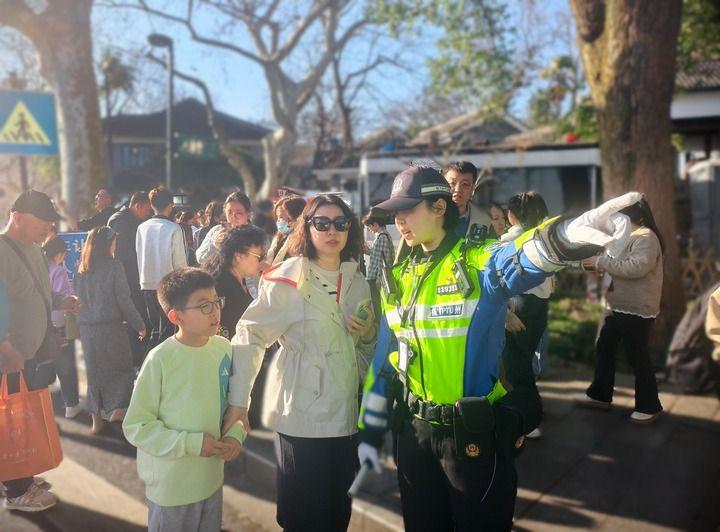 “绿灯行人请快速通行”“附近停车位紧张,可以考虑通过公共交通换乘到达”……在断桥与北山路交叉口,杭州市公安局交管支队景区大队灵隐中队民警李雨杭与同事指挥着行人和车辆,忙碌而从容。