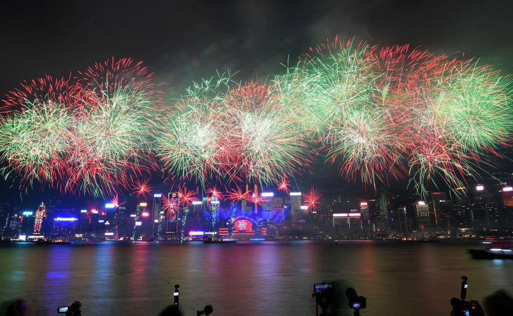 农历正月初二晚上,香港维多利亚港上空烟花璀璨。“马蹄铁”“元宝”等带有春节元素的礼花绽放,照亮夜空。