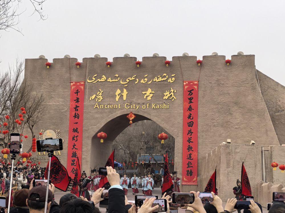 每天上午10时30分,喀什古城东门外便聚满来自五湖四海的游客。大家举起手机、相机,甚至掏出自拍杆,翘首以待开城仪式的到来。来自成都的游客唐志慧和家人在人群中穿行,脸上满是新奇与喜悦:“这是我们第一次来喀什,也是第一次在这里过年。看社火、逛巴扎,太热闹了,这里的年味特别浓,让人难忘!”