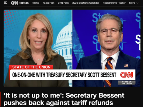 但问题在于,贝森特把“没有谈退款细则”包装成“最高法院没有真正触及核心、只是狭义解读、还要等下级法院几周甚至几个月”,这个“太极”就打大了。首先,这种说法容易让观众误以为:最高法院只是把球踢回去,IEEPA关税的合法性还悬而未决。但实际上,最高法院把结论写得非常明确:IEEPA不授权总统征收关税。其次,判决虽然把退款问题交给了下级法院,但执行退款的主体一定是海关、财政部等行政机关,法院最多是下命令、定原则,而不可能替政府打款做账。最后,在司法实践中,行政部门完全可以主动制定退款方案、与企业和解,或者相反,通过程序战术实现拖延或上诉,把账拖个几年,这些选择都是真实存在的政策工具,而不是法院说了算、政府只能被动听令。