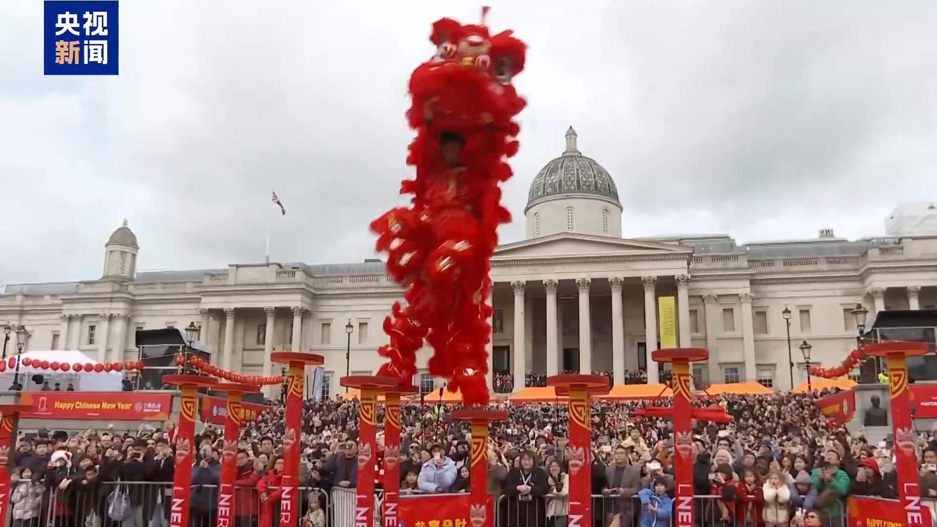 总台记者 杨兢兢:我现在是在英国伦敦特拉法加广场的中国新春庆典上,活动每年吸引近80万人参与,被认为是亚洲以外规模最大的春节庆祝活动。