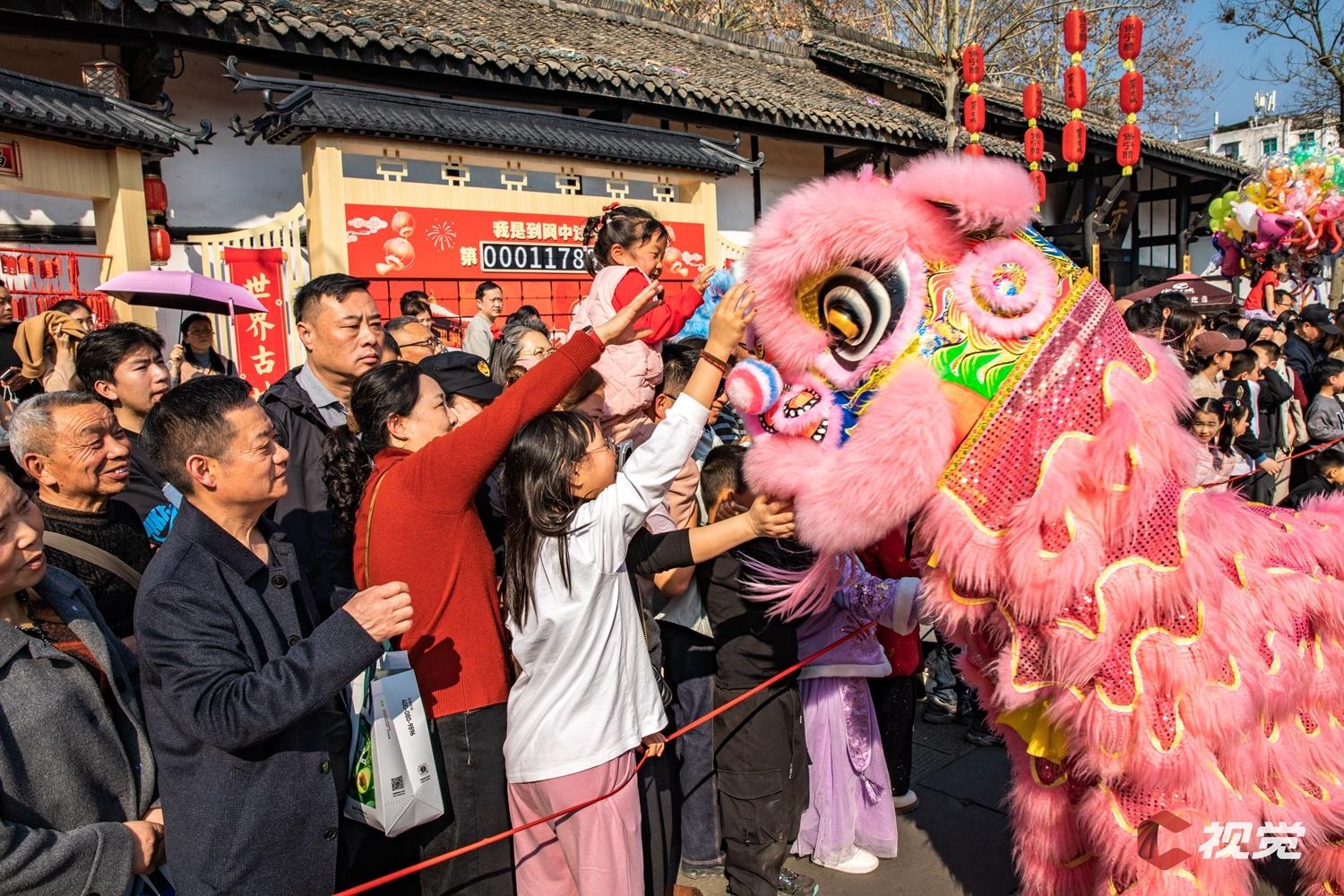 2月21日,南充市阆中古城,游客们与“醒狮”互动。