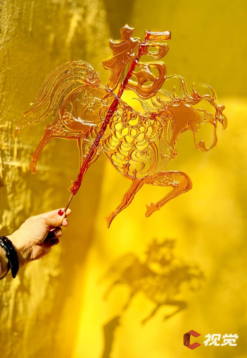 2月21日,成都市双流区彭镇老街,游客手持“马福”糖画,定格马年福气。