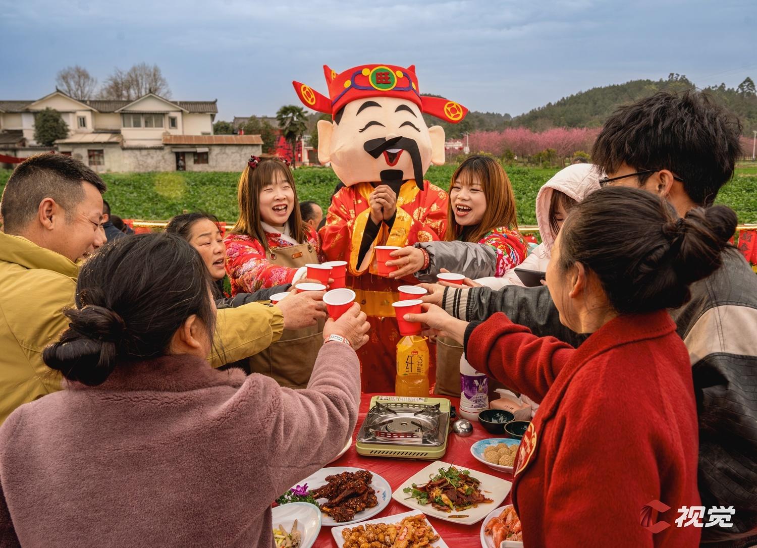 2月15日,成都彭州市桂花镇利济村,四方来客共赴一场田间团圆坝坝宴,分享乡村振兴的喜悦和新春的欢乐。