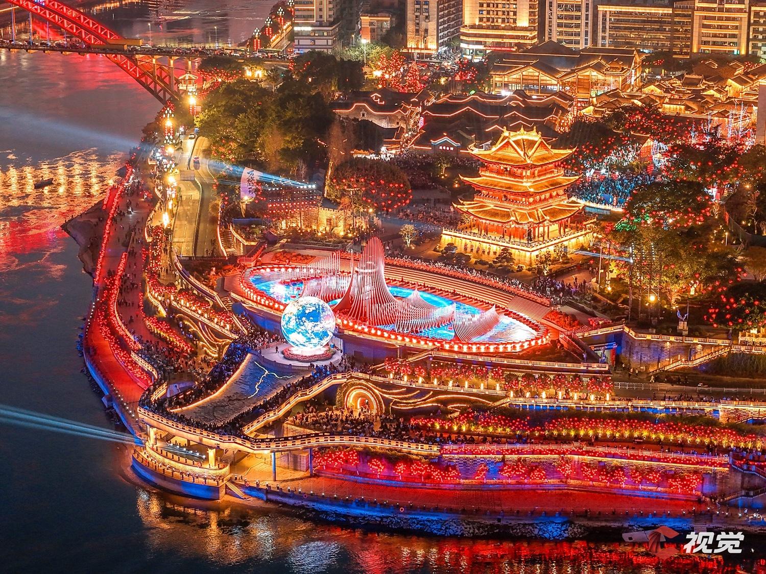 2月20日,总台春晚宜宾分会场主舞台搭建地合江门广场灯火辉煌、流光溢彩,古建塔楼与现代舞台交相辉映。