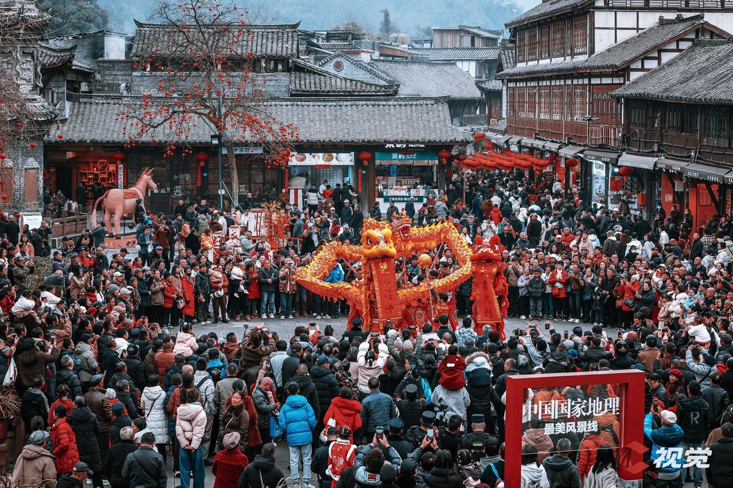 2月17日,成都崇州市街子古镇,一场精彩纷呈的龙狮表演在银杏广场火热上演。