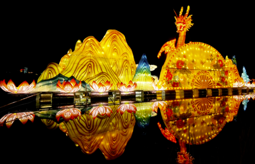 在植物园正门,巨型国潮大门“诗画烟台”率先惊艳亮相;沿着园区主干道,生肖白马、祥龙腾跃、福禄葫芦等传统主题灯组次第绽放,蓬莱仙境传说、胶东民间故事等特色灯组也竞相亮相。