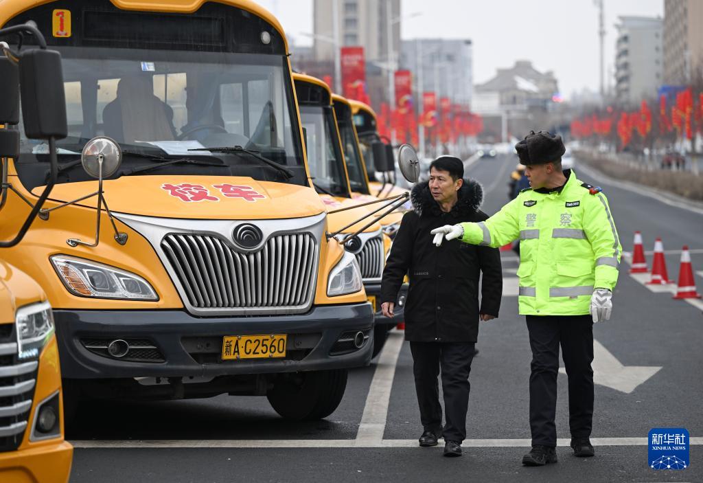 2月27日,新疆乌鲁木齐市公安局交通管理支队水磨沟区大队民警(右)在检查校车外观。