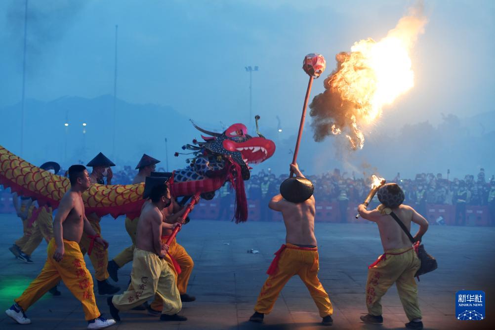 2月27日,在广西宾阳县炮龙文化广场,人们在炮龙节上舞炮龙。
