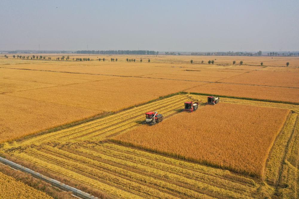 在吉林省公主岭市,吉林省米兜种植农民专业合作社进行机械化收割水稻作业展示(2025年10月14日摄,无人机照片)。新华社记者 张楠 摄