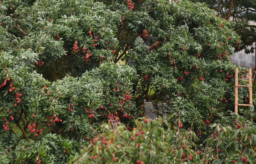 果农在广东茂名高州名园生态园采摘荔枝(2025年6月4日摄)。新华社记者 邓华 摄