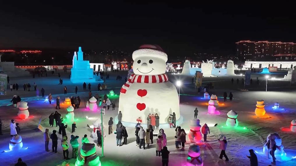 在锡林郭勒盟的锡林湖上,百余座冰雕雪雕将湖畔装点成如梦似幻的冰雪童话世界。