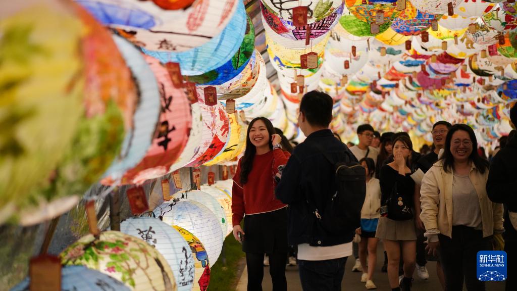 另一展区西门町则携手大陆品牌“泡泡玛特”,以6个人气IP的马年全新造型为核心,打造五座特色灯组。台北市民徐小姐手里拿着“LABUBU”造型红色气球逛灯会。“这些灯组很可爱,也为西门町商圈增添了新活力。”她说。