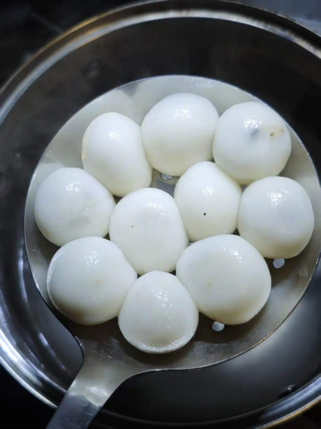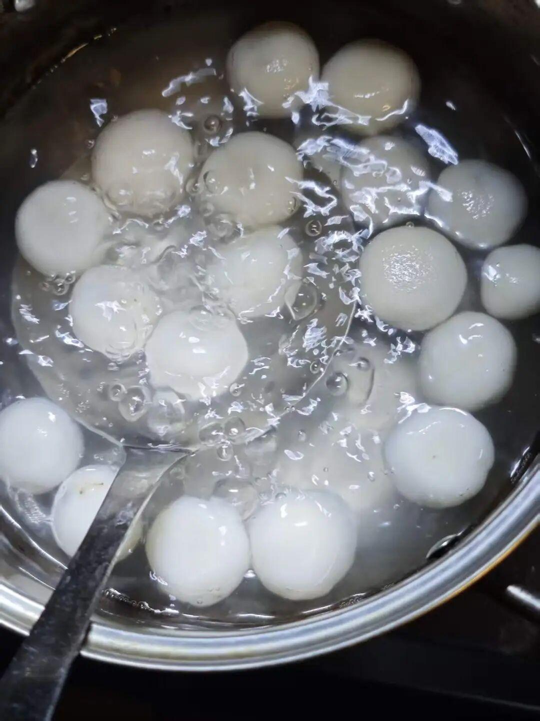 煮汤圆的含金量虽然不高,但它却是检验汤圆质量的最后一关。忙了大半天,就怕圆圆的汤圆朋友“张口笑”。等水沸腾了,将白团团们一个个地轻投进去,用瓷勺慢慢地朝一个方向搅动,要保证不粘锅底。时间是个有意思的维度,你越是急,它越是慢;而当你沉下心来静待,它却会赏你一口期待的果。所以,小火慢煮是最锻炼耐心的时候,绝不能离开,因为往往就那么一小会儿,水就溢出锅外。