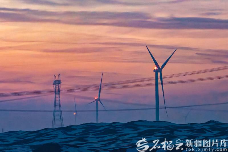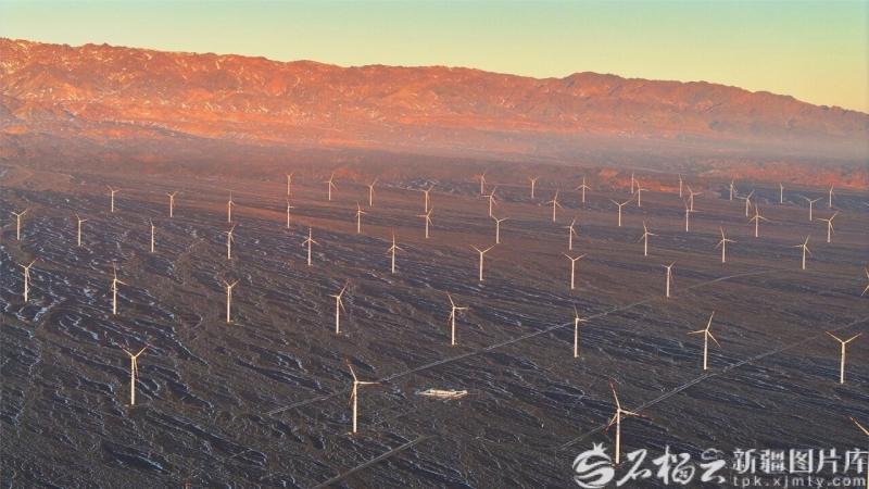 1月12日,在哈密市伊州区东部拍摄的哈密烟墩风电基地一角。石榴云/新疆日报记者 蔡增乐摄