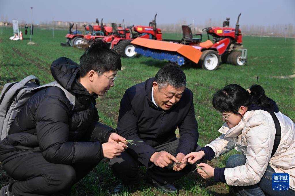 3月6日,在青岛市即墨区蓝村街道壮武村,青岛市种粮大户姜永战(中)查看小麦生长状况。