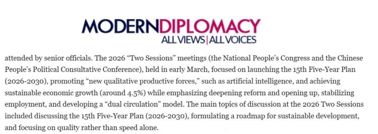 欧洲《现代外交》网站近日刊登埃及本尼苏伊夫大学副教授纳迪亚·赫尔米博士的评论文章称,今年中国两会重点关注发展模式创新与深化伙伴关系。会议议题包括通过共建“一带一路”倡议推动“高质量发展”,深化数字经济、基础设施及能源领域的国际合作,为推动构建人类命运共同体提供重要平台。