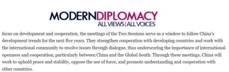 文章分析说,以发展与合作为核心,两会为观察中国未来五年发展趋势提供了一个窗口。会议将加强与发展中国家的合作,并携手国际社会通过对话解决问题,从而彰显国际开放与合作的重要性,尤其是在中国与全球南方国家之间。通过会议可以看到,中国将致力于维护和平与稳定,反对使用武力,并促进与其他国家的理解与合作。