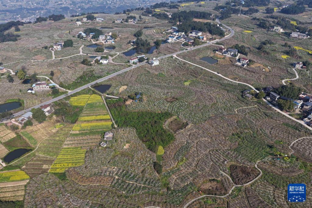 3月11日,重庆市永川区尖山村梨花竞相绽放(无人机照片)。