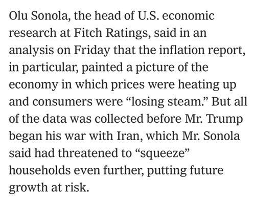 文章称,通胀实际上在年初有所上升,年增长率达到2.8%。这抵消了一月份美国个人收入的增长。惠誉评级美国经济研究主管奥卢·索诺拉的分析指出,通胀报告描绘了一幅美国经济图景:价格上涨,消费者“失去动力”。这场战争可能会进一步“挤压”美国家庭,危及未来的增长。