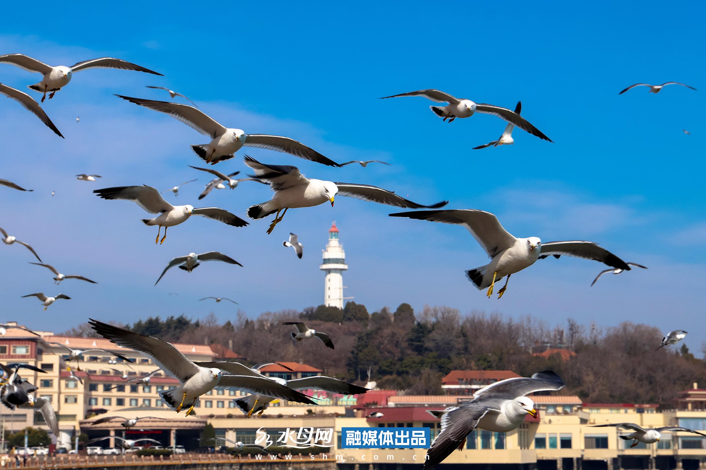 春分时节,烟台天气晴好,海风温润。滨海广场的海面上,成群海鸥或低空盘旋、或逐浪嬉戏,清脆的鸣叫声与海浪声交织。澄澈的海水湛蓝如宝石,在阳光下波光粼粼,治愈感拉满,吸引市民驻足观赏、拍照留念。