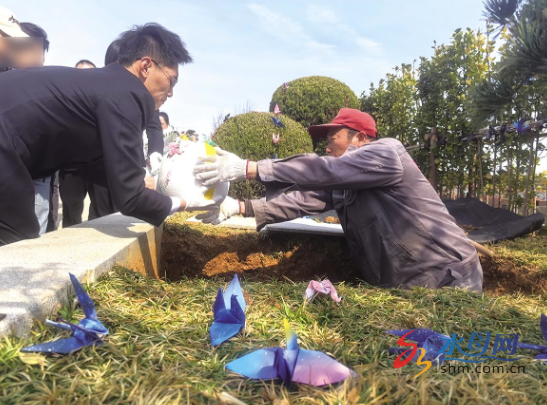 令人动容的安葬仪式环节,《春归》追思曲轻柔响起,家属们在礼仪师引导下,手持骨灰坛缓步走向安葬区。家属们依次将可降解骨灰坛放入葬穴,拿起混合松针、花瓣的五色土壤轻轻撒下,象征着逝者与春日生机共生、与山海气息为伴。家属们将亲手折叠的千纸鹤放置在葬区草坪上。一只只承载着思念的纸鹤,如同把牵挂“种”在了这片土地上,随春风、绿草、山海,年年岁岁陪伴至亲。