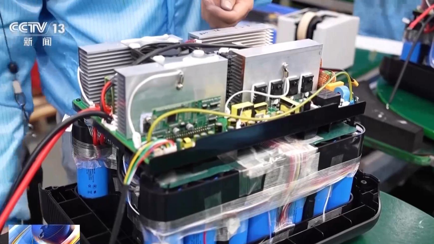 在企业生产车间里,记者看到的是一派繁忙的景象,一台台储能设备正在被组装、装车。这种移动储能设备一般长40厘米、宽20厘米、高20厘米,相当于一台小型打印机的体积。在欧洲和美国普遍被用于家庭的应急备电、户外用电等场景。一台电源能支持90%以上家电设备。