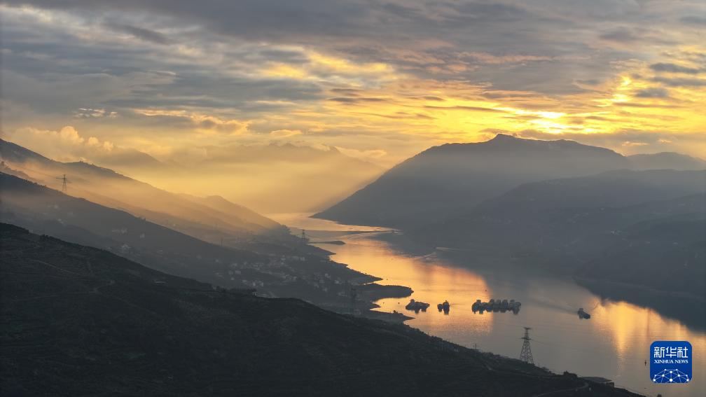 傍晚时分,落日余晖下的长江重庆奉节段秀美如画,别有一番风味(3月24日摄,无人机照片)。