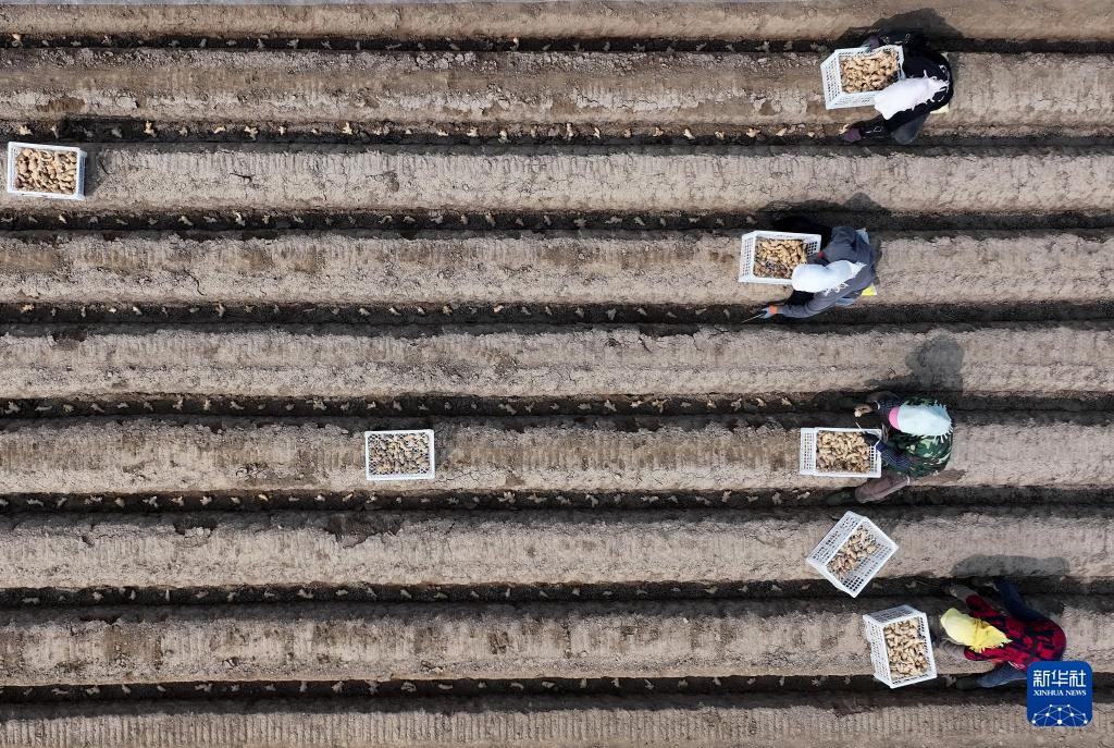 3月26日,河北省唐山市丰南区大新庄镇的农民在田间播种生姜(无人机照片)。