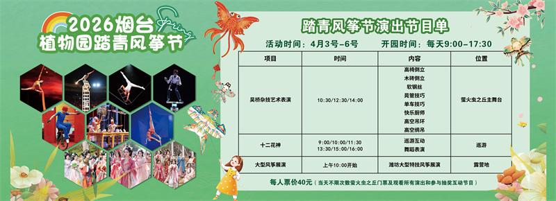 水母网3月27日讯 春风拂面,纸鸢翩跹,烟台市民的春日休闲生活再添新去处。“鸢舞筝春”2026烟台植物园凤凰风筝季将于4月3日至6日在烟台植物园举办,活动融合非遗风筝文化、特色演艺、亲子互动与便民消费,为市民打造一场兼具文化内涵、观赏乐趣与休闲体验的春日盛会,进一步丰富市民日常休闲生活,激活城市春日消费活力。