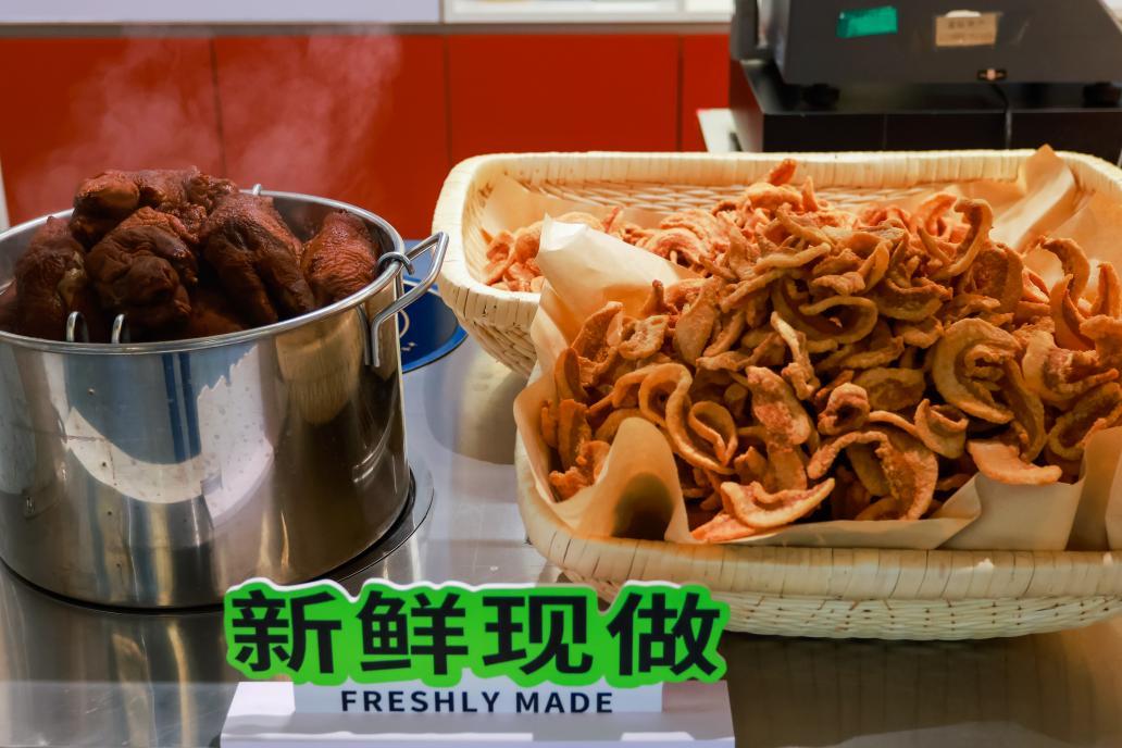 喜旺的柜台里,经典的老味道一直都在。而如今,更多美味是看着做、趁热吃的新鲜模样。走进喜旺恒达市场店,最先吸引人的,是那一锅刚出锅的脂渣。精选肥瘦相间的松板肉,在油锅里低温慢炸,热气腾腾间,多余的油脂被一点点逼出。捞出来时,金黄酥脆,咬一口——肥肉软糯化渣,瘦肉越嚼越香,却不觉得腻。有顾客买了直接站在柜台边尝了一口,说:“这下好了,追剧的零食有着落了。”