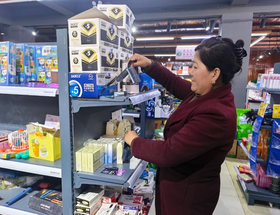 切娃乡兴农惠民超市工作人员曲珍在摆放货物。记者 马晓艳 摄