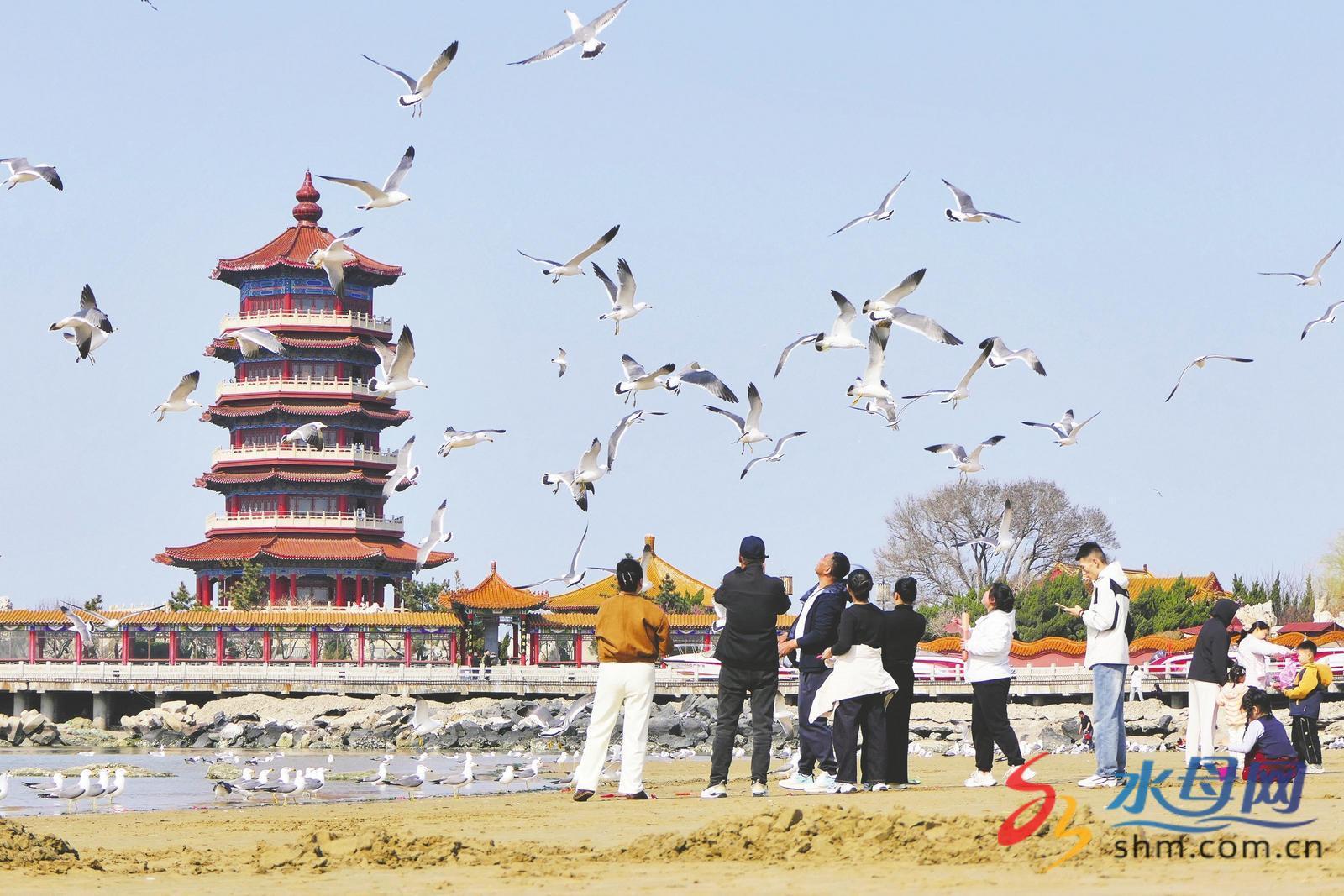 3月28日,在烟台市蓬莱区八仙过海景区沿岸,众多海鸥飞舞嬉戏,引来游客观赏与互动,为春日海滨增添了灵动生机。