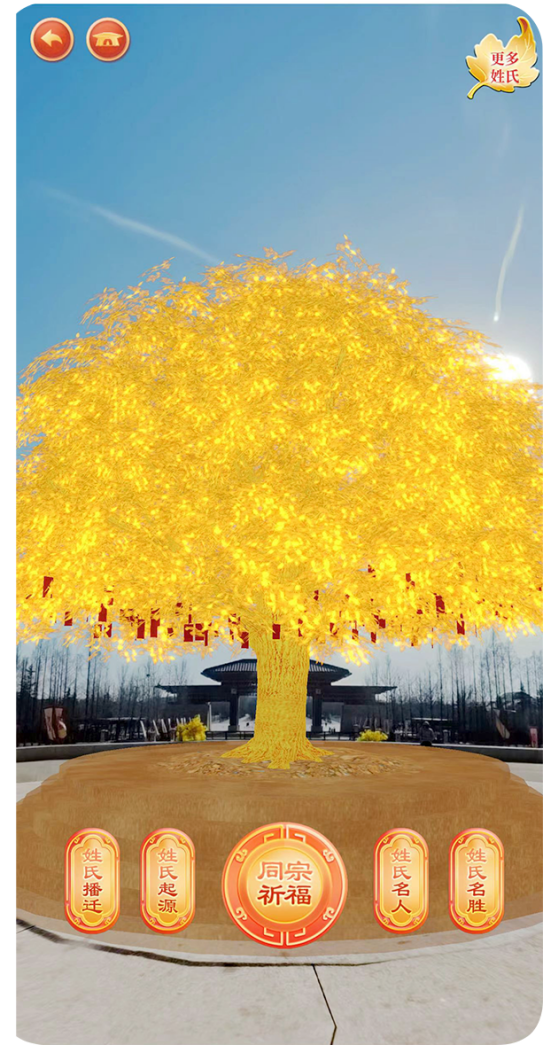 “百家姓”模块以“万姓同根,根在黄帝”为创作理念,深度融合传统文化,展示中华姓氏源远流长的宏大叙事。页面中央是枝繁叶茂的参天巨树,网友输入自己的姓氏后,可清晰追溯该姓的起源、迁徙脉络及历代名人故事,仿佛沿姓氏根脉回溯千年,与先祖完成一场跨越时空的对话。“同宗祈福”功能则进一步延展互动维度,让网友将祈福语悬挂于树上,生成专属祈福海报,寄托对家国的深情祝愿。
