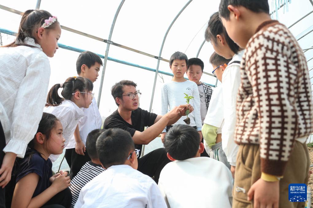 4月1日,在位于江苏省句容市的江苏农博园,工作人员给小朋友讲解种植知识。