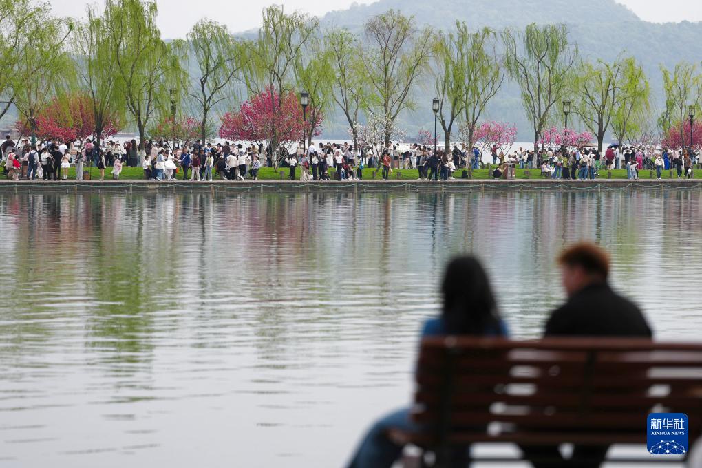 4月2日,游客在杭州西湖景区的白堤上游览。“间株杨柳间株桃”是西湖白堤特有的景观。