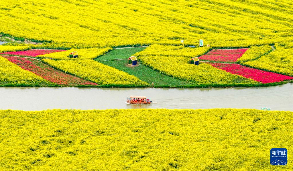 4月4日,游客在江苏省高邮市湖上花海景区乘船游玩(无人机照片)。