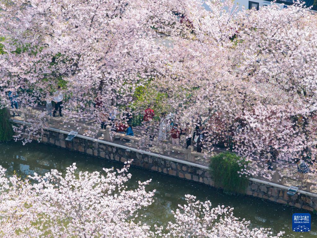 4月5日,人们在江苏常熟市内的护城河畔观赏樱花(无人机照片)。