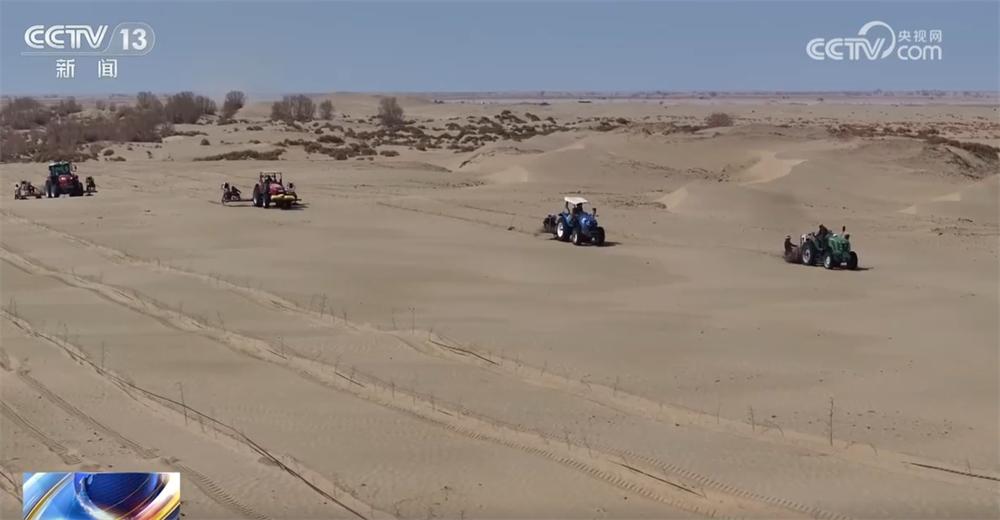 刚进四月,塔克拉玛干的正午就烈日炎炎。几台无人驾驶的种树机在北斗导航的指引下匀速前行,每一台机器走过,身后便留下一行笔直的树苗,两列树苗之间留出了5米宽的行距。