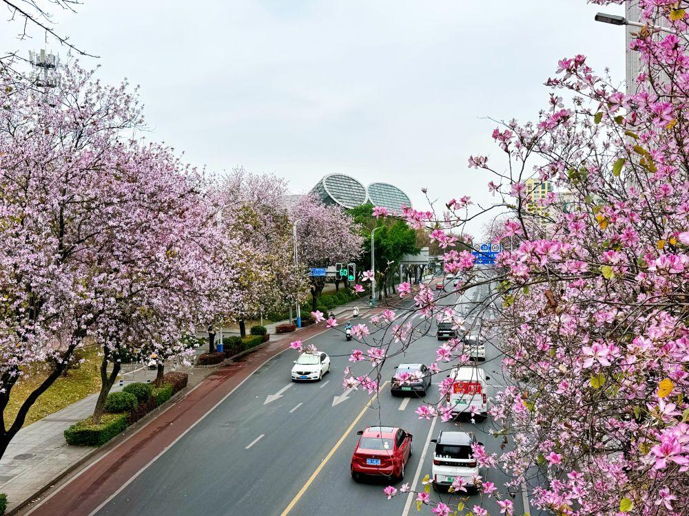 柳州则将花海铺满全城,30万株洋紫荆覆盖柳州的城市主干道、公园及沿江区域,形成独特的“点线面结合”观花网络。“人游花海,城入花园”,是柳州写给春天的生态注脚。