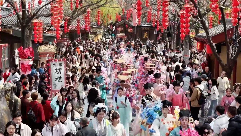 河南开封各景区将清明习俗与宋文化深度融合。在清明上河园景区,游客可在“大宋簪花游园会”参与互动赢取鲜花。