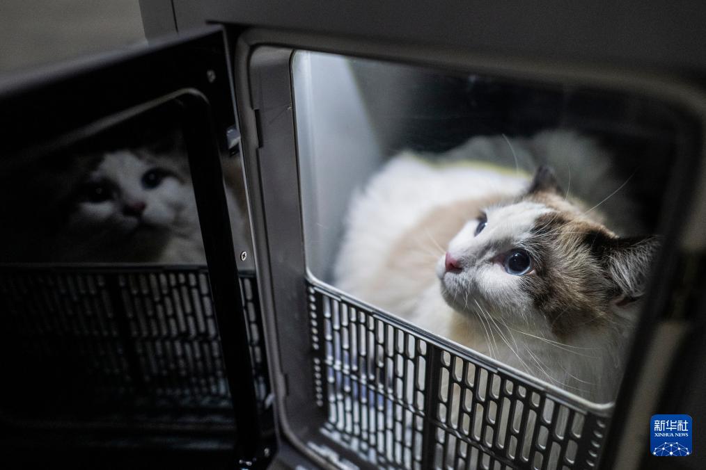 4月11日在湖北省武汉市汉口站拍摄的专用宠物运输箱内的宠物猫。