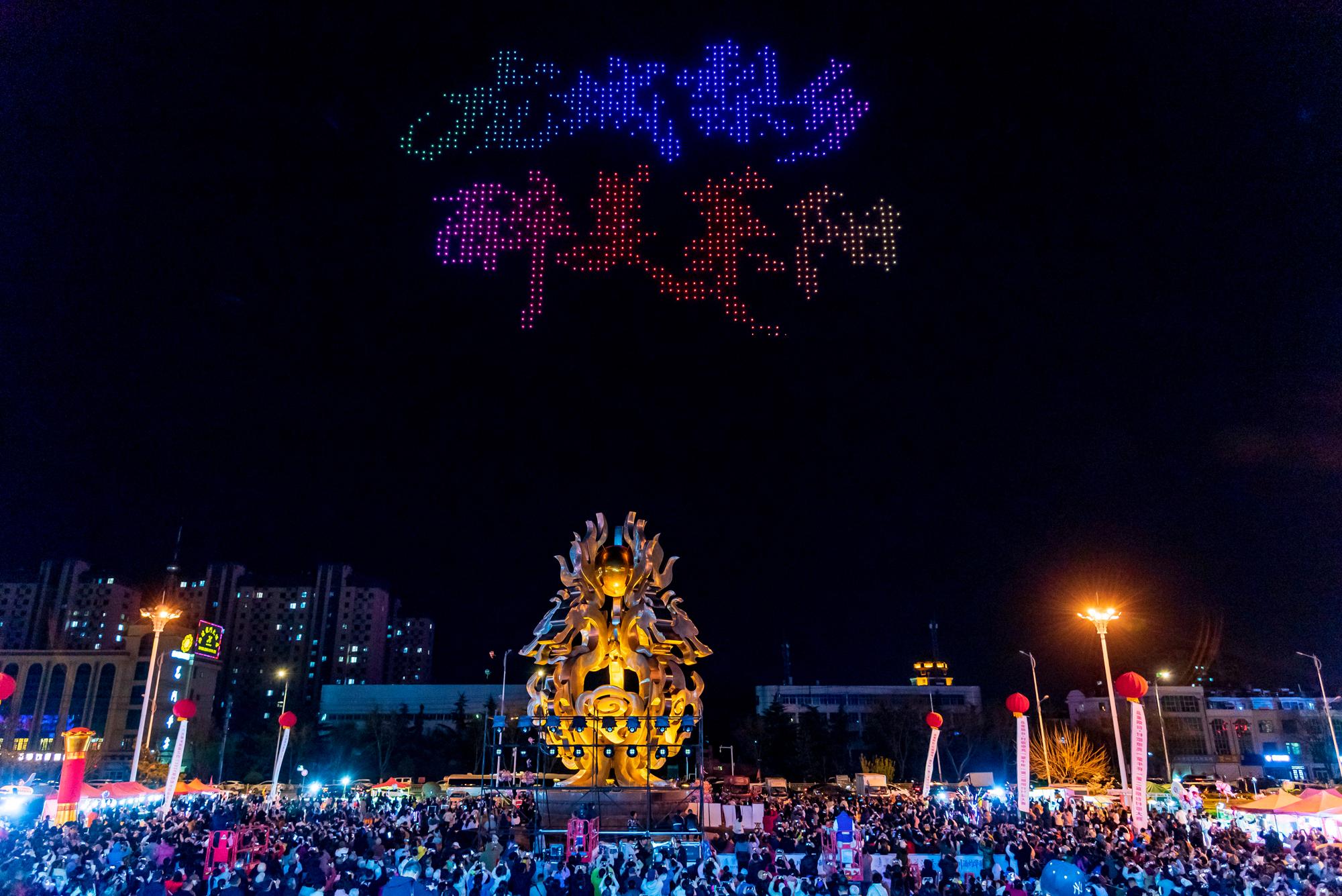 当晚最震撼人心的环节当属千架无人机光影表演。12分钟里,无人机编队以夜空为画布,依次呈现“中国梨乡”“中国恐龙之乡”“中国花生油之乡”三大名片,勾勒“莱阳味道”全球格局,展现螳螂拳的武魂风采,点亮“龙城梨乡·醉美莱阳”的诗意画卷。随后,“莱阳村歌唱响中国”唱出乡村振兴喜悦,莱阳村歌赞助企业品牌依次闪耀,传递品质与幸福承诺。最终,漫天星光汇聚成“我爱莱阳”的深情告白,为观众带来一场科技与艺术交融的视觉盛宴。