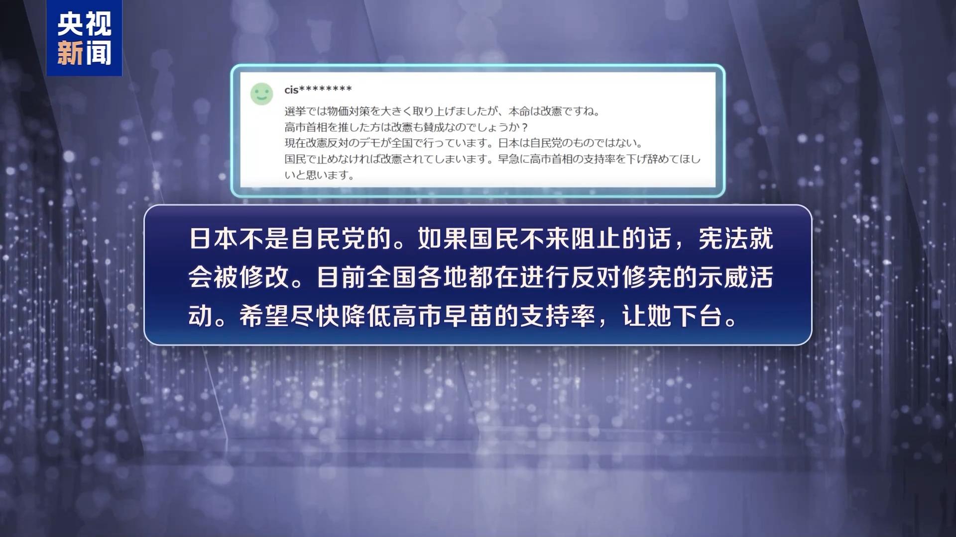“日本不是自民党的。如果国民不来阻止的话,宪法就会被修改。目前全国各地都在进行反对修宪的示威活动。希望尽快降低高市早苗的支持率,让她下台。”