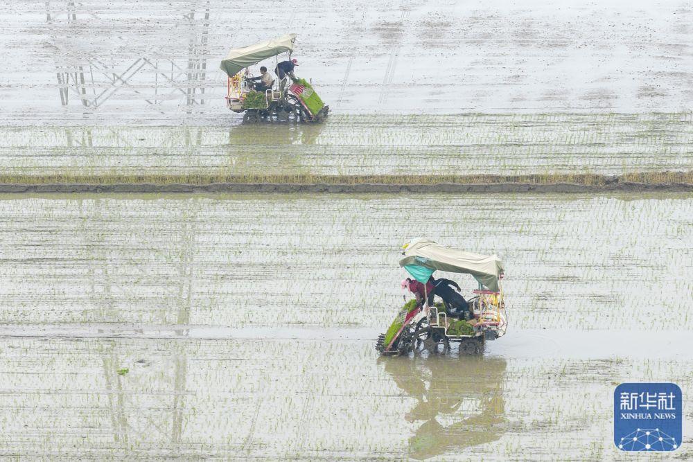 ↑ 4月11日,湖南省衡阳市祁东县金桥镇村民驾驶插秧机进行早稻插秧工作。新华社发(曹正平摄)