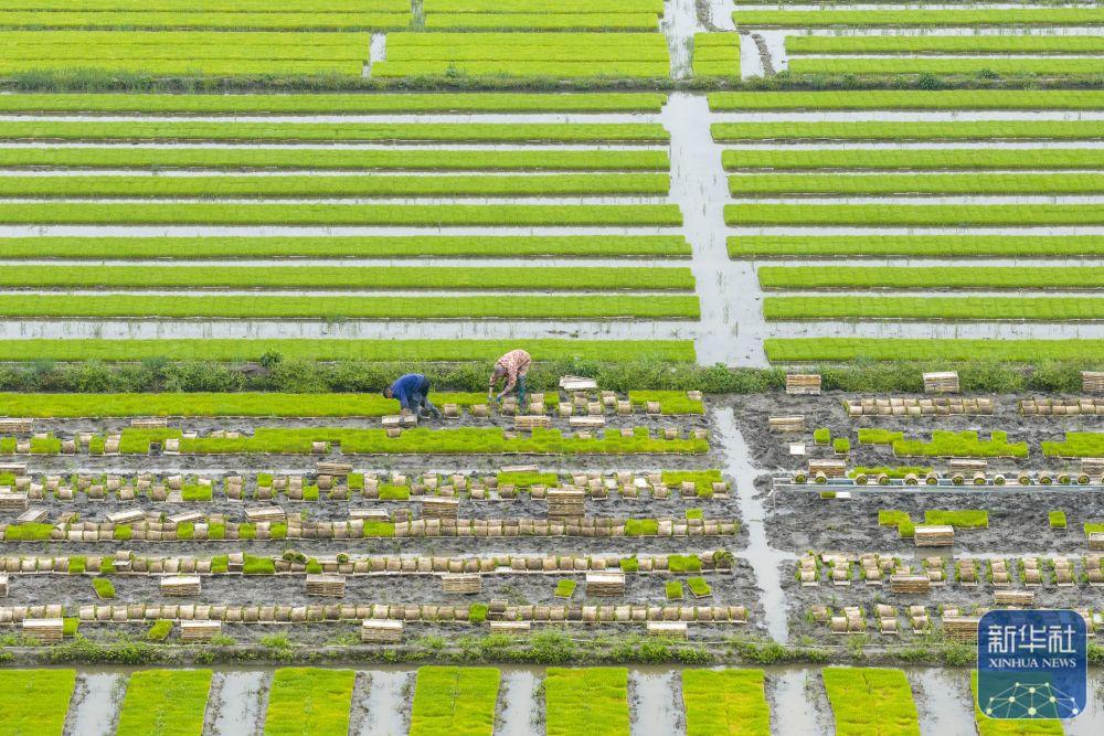 ↑ 4月9日,湖南省常宁市胜桥镇农民在管护秧苗(无人机照片)。新华社发(周秀鱼春 摄)